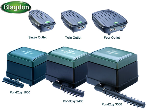 | Use the table below to select the correctly sized item. If you have any difficulties deciding which size is right for you, contact us by email or phone and we will be very happy to assist you. Although many factors including humidity, temperature, stocking density and surface area to pond volume ratio, can affect the Oxygen levels within a pond. We generally recommend a minimum air flowrate of: 100 Litres Per Hour (1.7 Litres Per Minute) / 1000 Litres (220 Gallons) of Pond Volume Or 450 Litres Per Hour (7.5 Litres Per minute) / 1000 Gallons (4500 Litres) of Pond Volume | Air Pump | Litres per hour | Air Stones | Max Depth (m) | Max Pond Volume (Litres) | Watts | | Single Outlet | 140 | 1 | 1.2 | 1000 | 4 | | Twin Outlet | 320 | 2 | 1.4 | 2000 | 5 | | Four Outlet | 640 | 4 | 1.6 | 4000 | 9 | | PondOxy 1800 | 1800 | 6 | 2.2 | 10000* | 16 | | PondOxy 2400 | 2400 | 10 | 2.8 | 15000* | 20 | | PondOxy 3600 | 3600 | 20 | 3 | 22000* | 32 | | * Volumes shown are for goldfish ponds, half them for Koi ponds. | |