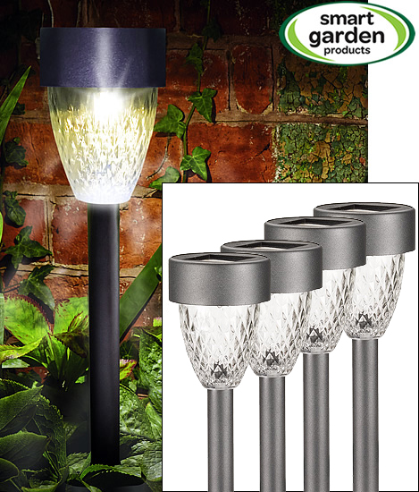 The Cygnus Solar Post Lights (4 Pack) from Smart Solar Garden Products are a sleek and stylish solar powered set of 4 marker lights which are perfect for borders, paths, patios, driveways or anywhere within a garden. Each of these Solar powered lights is fitted with a small solar panel at the top, which charges the lights ready for night time use. The built-in light sensor automatically switches the lights on at dusk. Each of these lights has an attractive brushed stainless steel construction and a heavy duty glass to optimise light dispersal. Internally this post light features a super bright warm white LED which produces 5 lumens of light and will run for up to 6 hours when fully charged.