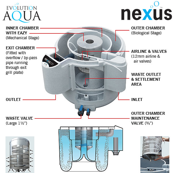 | How The Nexus Works The Nexus filter is simple yet innovative. Water enters the Nexus via the inlet into the inner chamer which works as a asic vortex allowing larger solids to settle out. The water then passes through the Eazy where the finer particles are removed at the mechanical stage of filtration. From the Eazy the water passes into the outer chamer where the iological stage of filtration takes place using the K1 Media Moving ed. The water then passes through the grill into the Exit Chamer, where it is returned to the pond through the outlet. The Eazy is cleaned y diverting the air from the Outer Chamer to the Eazy using the air valves. Waste is then discharged through the larger waste all valve. The Eazy has een designed so that it can e easily lifted out of the Nexus should it e needed. The Eazy Filter The Eazy is a stainless steel vessel containing a set volume of K1 Micro Media (20 litres in the Nexus 320 and 18 litres in the Nexus 220) which is located within the inner chamer of the Nexus. After water enters the Nexus it rotates around the Eazy in the inner chamer with a downward motion allowing the larger solids to settle to the ottom of the chamer efore passing through the slots of the Eazy into the static K1 Micro. The water flows from all angles through the K1 Micro where improved mechanical filtration and settlement takes place and fine particles are caught within the K1 Micro. The water then flows through the slots in the centre column and into the outer chamer. Biological Filtration The outer chamer of the Nexus contains the moving ed of K1 Media. This is where the final stage of iological treatment occurs. iological reakdown occurs through different strains of acteria living on the protected surface area on each piece of the K1 Media. These acteria convert Ammonia and Nitrite into harmless Nitrate. The amount of Ammonia and Nitrite produced in the pond is dependant on feed rates and the type of food used. For higher feed rates additional K1 Media should e added into the outer chamer. In optimum conditions 250g per day of average protein content food will e roken down y 50 litres of K1 Media. To ensure excellent iological filtration of a Nexus maintain a pond pH of 7 or higher. acteria conversion rates are reduced in cooler temperatures. |