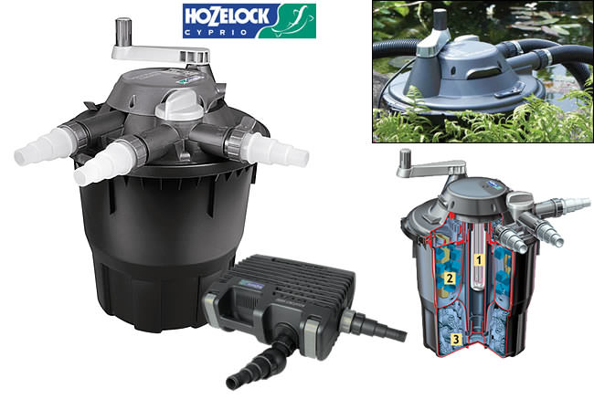 | The Hozelock Bioforce Revolution is the next generation of pressurised pond filtration, from the company who first introduced pressurised pond filters over 25 years ago. As a result of a 5 year development and design program the Hozelock Bioforce Revolution Pond filter features a revolutionary patented easy clean system. Small in size, but large in features its 3 step filter process produces Clear and Healthy Water with simple dry hand cleaning. 1. The integrated high power UV Clarifier will eliminate green water and is contained in a quick access chamber for trouble free bulb replacement. For enhanced performance it also features a viewing window that glows when operating and integrated turbulator to improve circulation. 2. Mechanical Filtration - The Hozelock Bioforce Revolution features a unique filtration process which uses foam cubes (CypriCube) with upward foam compression to catch dirt particles. The dirtier the filter gets, the finer the particles it can catch. 3. Biological Filtration - The use of large surface area Kaldnes K3 biological media in the Hozelock Bioforce Revolution accommodates huge quantities of beneficial bacteria to maintain healthy water. Simple, Dry Hand Cleaning Turn the top dial to the "Flush" position to direct the water down the cleaning pipe (to waste) Wind the handle to activate the internal cleaning blades that separate solids from the Cypricube foams. Wait for the water which is flowing out of the cleaning pipe to run clear Turn the top dial to the "Run" position The Hozelock Bioforce Revolution can be hidden at the side of a pond or buried in the ground up to the level of hose inlets and the pressurised design of the filter allows the water to be pumped to a higher exit point to feed waterfalls and streams Hozelock Bioforce Revolution - Main Features Unique Foam Cubes (CypriCube) Filtration Kaldnes K3 Biomedia included UV Water Turbulator Single ended UV lamp UVC Viewing Point Can be buried up to lid level True "Dry Hand" cleaning 5m Main Cable 2 Year Guarantee Hozelock Aquaforce - Filter Pumps The Hozelock Aquaforce range of pumps offer improved efficiency, performance and reliability. The range has been specifically designed for filtration, waterfalls or watercourses and offers a cost effective flowrate in terms of initial purchase and running costs. The new robust all-in-one cage design is quick and simple to open, but offers a considerably increased cage surface area, allowing the maximum amount of waste to be collected and pumped to the filter system. It also means that the cage is far less likely to clog reducing the need for cleaning. Included with the pump is the new wildlife protection insert, which allows you to reduce the inlet solids diameter from 6-10mm (depending on model) down to 2mm. This prevents wildlife such as Tadpoles, Newts and small fish getting into the cage. The motors feature a water cooling system, which ensures that the pumps are kept at a constant temperature and reduces the risk of overheating. Ceramic bearings along with thrust washers ensure the motors are ultra reliable. The larger models (6, 8, 12 and 15000) are able to operate either in or out of the pond, they also feature a second inlet, which allows an optional skimmer or satellite filter Additionally the included flow control allows the flow of water to be adjusted to suit your installation. Supplied with 10m of cable and hosetail for 20, 25, 32, and 40mm connection sizes. Due to their proven reliability Hozelock have now increased the guarantee on the Aquaforce pumps to 5 years. | |||