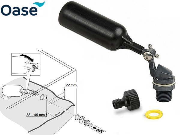 The Oase Auto Pump Chamber Fill Kit uses a simple and reliable "toilet cistern" type float valve which can be fitted to the flat surface of a plastic reservoir (through a 22mm diameter hole) and then connected to a mains water feed pipe.