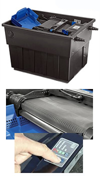 | With the introduction of the BioTec ScreenMatic 2 Filters Oase have shown that they are always innovating and improving their pond filters. The New and upgraded Biotec ScreenMatic 2 range now features an improved coarse debris system and electronic control system. Simple operation, fast, clean maintenance and outstanding filtration results are the unique features of these filters. A specially designed sieve catches all debris particles above 300 microns that arrive in the filter. The sieve has been designed as a belt which rotates when dirty via a built-in 12v motor and is scraped clean as it turns. The dirt build up on the screen is monitored by a new sensor system which only operates the 12v motor when needed, thus saving running costs and wear and tear. The waste falls in to an increased capacity tray for disposal. The water which is enriched with oxygen, then falls into the chamber below, flows through the filter zones and then reaches the next filter chamber. The friendly filter bacteria present in the pond water settle and multiply in the oxygen rich sponges. The individual chamber situated just in front of the outlet holds a number of Zeolite filled cartridges which are ideal when starting up the filter. Once established the material inside can be changed to Phosless (not supplied) which will help prevent algae growth in the pond. Each filter is also supplied with a plunger to allow for easy cleaning of the foam cartridges and a brush to aid cleaning of the belt. Once the foams have been squeezed out a valve is pulled and the dirty water drains from the tank. The drain is at the bottom of each filter and is 50mm on the 40000, 60000 and 90000 and 75mm on the 140000. All units supplied with a 2 year guarantee which can be upgraded to 3 years by registering your purchase with Oase. Oase Biotec ScreenMatic 2 Pond Filter Features Intelligent filter system for fish ponds up to 70m³ (70000 litres) The automatic coarse debris extraction using "conveyer belt" sieve technology High quality filter sponges for biological filtration Intelligent control functions Simple plug & play operation 300 µm first stage cleaning sieves Pollutant discharge using included slide valve | ||||