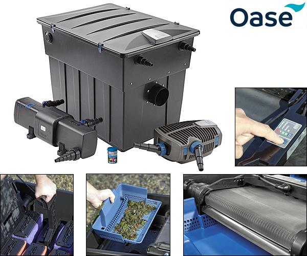 | The Oase BioTec 90000 ScreenMatic OC 2 - Complete Filtration Systems are complete kits that come with the state of the art BioTec 90000 ScreenMatic 2 Pond Filter, Bitron C Ultra Violet lights and the Aquamax Premium Filter Pumps. With the introduction of the BioTec 90000 ScreenMatic 2 Filters Oase have shown that they are always innovating and improving their pond filters. The New and upgraded Biotec ScreenMatic 2 range now features an improved coarse debris system and electronic control system. Simple operation, fast, clean maintenance and outstanding filtration results are the unique features of these filters. A specially designed sieve catches all debris particles above 300 microns that arrive in the filter. The sieve has been designed as a belt which rotates when dirty via a built-in 12v motor and is scraped clean as it turns. The dirt build up on the screen is monitored by a new sensor system which only operates the 12v motor when needed, thus saving running costs and wear and tear. The waste falls in to an increased capacity tray for disposal. The water which is enriched with oxygen, then falls into the chamber below, flows through the filter zones and then reaches the next filter chamber. The friendly filter bacteria present in the pond water settle and multiply in the oxygen rich sponges. The individual chamber situated just in front of the outlet holds a number of Zeolite filled cartridges which are ideal when starting up the filter. Once established the material inside can be changed to Phosless (not supplied) which will help prevent algae growth in the pond. Each filter is also supplied with a plunger to allow for easy cleaning of the foam cartridges and a brush to aid cleaning of the belt. Once the foams have been squeezed out a valve is pulled and the dirty water drains from the tank. The drain is at the bottom of the BioTec 90000 ScreenMatic 2 Filter is 50mm. The Oase BioTec 90000 - ScreenMatic 2 Pond Filter Units and Bitron UV's are supplied with a 2 year guarantee which can be upgraded to 3 years by registering your purchase with Oase. However the included Oase Aquamax Eco Premium pumps are covered by a 3 year guarantee, which can be extended to 5 years free of charge, simply by sending the warranty card off to Oase. Oase Biotec 90000 ScreenMatic 2 Pond Filter Features Intelligent filter system for fish ponds up to 45m³ (45000 litres) The automatic coarse debris extraction using "conveyer belt" sieve technology High quality filter sponges for biological filtration Intelligent control functions Simple plug & play operation 300 µm first stage cleaning sieves Pollutant discharge using included slide valve Oase Bitron C UV's The Bitron C range of UV's are the result of many years of intensive research, which have culminated in this state of the art design. These ultra violet clarifiers are supplied with one inlet and two outlets. Both outlets have regulator values and by adjusting these you can control the amount of water which passes over the light. This enables the most efficient use of the light giving the best results. The build up of limescale in an ultra violet is well known for substantially reducing the effectiveness of a unit. This problem had been overcome in the Bitron C in two ways. Firstly the permanent magnets reduce the build up limescale in the whole pond system including pumps. Secondly a continuously spinning cleaning device, which is powered using the water flow, ensures that no build up, even silt, starts on the quartz sleeve. Each model has an integrated indicator light or window allowing you to quickly see if the bulb is working. Supplied with a 2 year guarantee, hose clips and a blanking cap if the two outlets are not required. Top Quality Oase AquaMax Eco Premium OC (2024 version) Filter Pumps The Oase AquaMax Eco Premium 5000 - 21000 are the very latest version of Oases' high performance AquaMax Eco range of solid handling pond filter pumps. For the 2024 versions Oase have redesigned the motor for the Aquamax Eco Premiums resulting in a quieter, more energy efficient pumps, saving 14% - 24% of the running costs (depending on the model) which should also help them last longer than their older models (that is saying something). The new motors have what Oase call "Core 6 Technology" which means they have six windings instead of the traditional 4, these windings have also been curved which produces smoother running, adding to their efficiency and also making them quieter. These new Oase AquaMax Eco Premium pumps also feature impellors that have been improved and are now effectively handmade with glass-fibre reinforced plastic making them much stronger and allowing them to take solids of up to 11mm in size. All of the new AquaMax Eco Premium pumps can now be controlled electronically via the Oase Smart Phone App using the DMX technology which is available in their OC ("Oase Control" system, formerly known as EGC) range of products. Individual pumps can be controlled using an Oase Eco Controller (OAE016) or if the pump is part of an installation using other OC products which can be remotely controlled then an adapter can be purchased to link other units (OAE077). All of the AquaMax Eco Premium pumps have the option of using the secondary inlet port to run an optional remote strainer (OAA501) or skimmer (OAA102), both of which can improve the circulation within your pond and reduce the likelihood of 'dead' areas and silt build up. Like their predecessors these pumps still have the seasonal function control (SFC) function which automatically slows the pump down (saving money) in colder water temperatures and they can still be dry installed (SFC does not work in dry installations) and reliable protection against blockages and dry running with EFC (Environmental Function Control) All AquaMax Eco Premium pumps are supplied with 10m of mains cable, inlet and outlet hosetails which will accept 25mm - 38mm flexible hosepipe and a 25, 32 and 38mm plastic hose cl