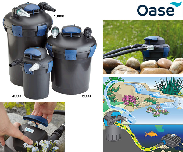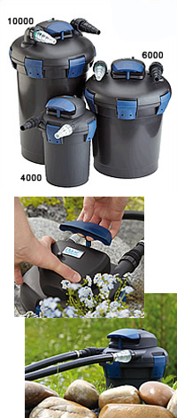 The Oase BioPress 10000 Pond Filter offer easy and convenient cleaning of the internal filters via the cleaning mechanism. Quick release lid clips also provide easy filter opening and closing for maintenance purposes when required. With different grades of filtration foam for optimal waste removal, the 10000 also has 20 bio-surface balls to allow high levels of friendly bacteria to colonise the filter. The Oase BioPress 10000 includes an integral Ultra Violet Light with an indicator window which makes it simple to see at night if the UV bulb is working. The Oase BioPress filter can be hidden at the side of a pond or buried in the ground up to the level of hose inlets and the pressurised design of the filter allows the water to be pumped to a higher exit point to feed waterfalls and streams and unlike other filter units the outflow water pipe can rise up to 2m from the filter location (provided the pump is powerful enough). Supplied with a 2 year product guarantee and has Oases' a clear water guarantee.