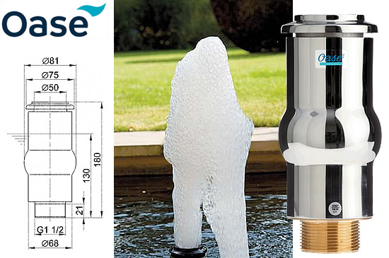 Oase Extra Large Foam Jet Fountain Head - 55-15e - 1½ Inch Thread (50987) - Product Sizing Use the table below to select the correctly sized item. If you have any difficulties deciding which size is right for you, contact us by email or phone and we will be very happy to assist you. Oase Extra Large Foam Jet Fountain Head - 55-15e - 1½ Inch Thread (50987) Performance | Flowrate / Pump | Jet Height (mm) | Jet Diameter (mm) | | 1900 | 50 | | 2500 | 50 | | 3000 | 50 | | 3400 | 50 | |