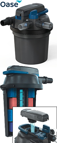 | The Oase FiltoClear pressurised pond filters are a highly developed range of pressurised filters which have outstanding filtration properties, are easy to maintain and have been redesigned and updated. The Oase Filtoclears now have an improved and unique, easy to operate built-in cleaning system. Simply remove the discharge cap, connect your waste hose (not supplied), pump the cleaning handle up and down removing all the waste and turn the valve to discharge. The benefit of a pressurised filter is the ability for it to be lower than the discharge point, which in many cases makes it easier to conceal. The Oase Filtoclear pond includes an integral ultra violet light with an indicator window which makes it simple to see at night if the UV bulb is working. The new design release in 2022 offers several improvements on the previous range - Easier to Clean mechanism, higher wattage lamps, no need to remove the quartz sleeve when changing the lamp, metal clamping ring and a hood over the UV electrical unit. The two large models (19000 and 31000) also include the patented UV cleaning rotor to help keep the quartz sleeve clean to maximise their efficiency . All Filtoclears are supplied with 5m of mains cable and a 2 year guarantee, which can be increased to 3 years by sending off the guarantee card to Oase. Also included are 4 hosetails, one each for the in, out and discharge hoses and one for the other end of the discharge hose Oase FiltoClear Pressurised Pond Filter Features Combination of mechanical biological cleaning and effective UVC technology Including OASE Clear Water Guarantee*C Ideal for supplying higher elevated watercourses or waterfalls Setup below the surface level of the water is also possible Patented Easy-Clean-Technology for easy and convenient cleaning without opening the filter Easy-to-operate waste outlet function UVC indicator light for monitoring of the UVC clarifier Pollutant level indicator and flow-through indicator All function-regulating parts are arranged so that they are easily accessible in the cover Through burying or covering with a decorative rock cover it can be perfectly integrated in the water garden Perfectly suited for architectural pools thanks to virtually invisible technology High-quality, impact-resistant material Larger Model Extra Features (19000 and 31000 Patented UV Quartz Sleeve Cleaning Rotor | |||||