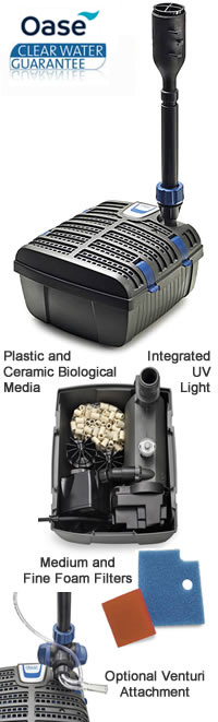 | The Oase Filtral Complete Pond Filters are the next generation of internal pond filters for wildlife pond of up to 9000 ltrs and Goldfish ponds of up to 4500 ltrs. These fully redesigned filters include an integrated pump, filter and UVC and can be completely hidden in a pond. The Oase Filtral pond filters provide clear and healthy water, are easy to install and have a choice of outflow connections. Small in size but large in features, these complete filter units incorporate both medium and fine grade foam for mechanical filtration, which is followed by ceramic and plastic media for biological filtration. The top quality construction and easy to open clips mean cleaning and maintenance of this product is quick and simple, and the inclusion of a simple UV indicator is a reassuring confirmation of the functioning of the UV light. The outflow can either be used to feed a small waterfall or feature via the included hosetail which will accept 13mm (½"), 20mm (¾") or 25mm (1") pipework (13mm only on 1500 size) or it can also be used to produce a fountain of various designs using the Fountain Kit, which we included as a FREE Extra. For ponds which require a little extra help with Oxygen levels, you can even add a Aeration Set as an optional extra. Oase Clear Water Guarantee Oase Filtral Complete Pond Filter Features An efficient integrated pump. 2 foam filter grades to ensure crystal clear water. Ceramic and plastic elements to ensure healthy fish and plants. A UVC to eliminate green water. Visible UV indicator light. Easy installation with just one 10m power cable. 2 Year Guarantee. Easy Installation One power cable for simple and cost effective installation. Low profile, for more discreet installation. | |||||