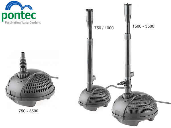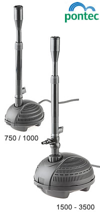 | The Pontec PondoVario Fountain Pump Sets are cost effective fountain pumps in a range of sizes. They are simple, compact and easy to use and control. All the PondoVario pumps are housed within a robust strainer cage which have fine slots suitable for wildlife ponds and fountain heads with small holes, however on the 1500 - 3500 models, these are in the form of removable panels which cover larger slots which if removed can reduce cleaning when feeding a fountain or feature which can handle larger particles. Each pump is supplied with a telescopic fountain tube with a flow controller and 4 fountain heads. The 1500 - 3500 sizes also include a T piece allowing the water flow to the fountain and a hose connection, both being independently adjustable. All models come with a 10m mains cable, internal thermal protection, a stepped hosetail which takes 12, 20 and 25mm hose and 3 year guarantee. Pontec PondoVario Fountain Pump Features Great value for money Flowrates 750 - 3500 litres per hour Fine or course inlet grill sizes (1500 - 3500 models) Includes telescopic fountain tube with flow control and 4 x fountain heads 3 year guarantee.