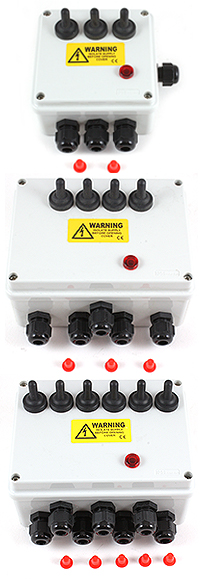 | These weatherproof switch boxes are highly resistant to impact, heat, chemical and atmospheric agents and intended for use outdoors, especially for water gardeners. Installation is easy, all you need to do is remove the 4 self tapping screws to release the lid and connect your incoming mains to the blue terminal blocks and the outgoing supply to the black terminal blocks. Controlling the attached devices is then as easy to use as a standard light switch. The switches are covered and sealed with black flexible PVC boot covers. Fitted on the bottom of the enclosure are the weatherproof cable glands, which will accommodate cables from 5 to 8mm in diameter. These boxes have a 5A fuse fitted and spare fuses are available. The maximum load on each switch is 360w and a total box load of 1200w. These boxes are supplied with installation instructions, two sealing plugs for unused cable glands and a neoprene lid sealing gasket. | |||