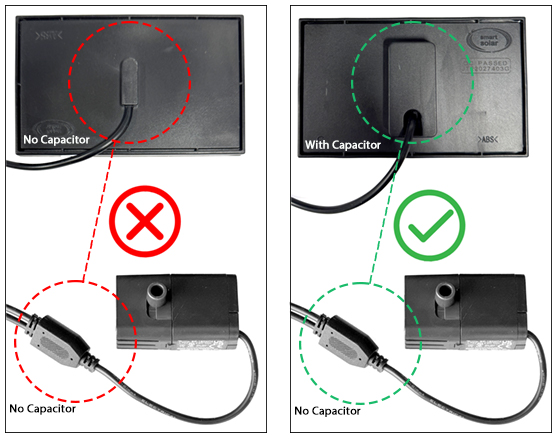 This version of the Twin Cabled Solar Pump does not have a capacitor in the cable, so it is only compatible with the new design of Twin Panels with the capacitors fitted in to the panels (see panel below). If you have the older panels WITHOUT capacitors and your pump need replacement, you will need a complete pump and panel set - Click Here for details