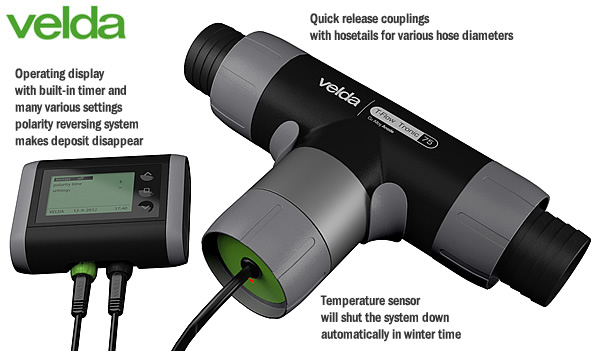 | The Velda T-Flow Tronic blanketweed remover is a revolutionary system that eliminates fibrous and slime algae from your garden pond in a way that is safe for fish and plants. The core of the T-Flow Tronic blanketweed remover consists of an anode, made from a mineral copper alloy developed by Velda, and a stainless steel cathode. By means of the microprocessor controlled display unit, pulses are generated, which are led to the core of the T-Flow Tronic. Through these pulses, positively charged copper ions are released, also known as mineralisation. These ions are also referred to as minerals. In a defined concentration, the ions form a natural barrier against algae. The concentration of copper ions to remove fibrous algae and stop the growth lies between 0.2 and 0.3 PPM. This is an absolutely safe concentration for people, animals, and plants. For comparison, according to the European drinking water standards, 2 PPM is the maximum allowed for drinking water. A positive side-effect of using the T-Flow Tronic is that the pond water will be healthy, and it spreads a neutral, fresh scent. Supplied with a 2 year guarantee. The cable lengths on the T-Flow Tronic Blanket Weed Remover between the control box and the end cap is 3.5m. The mains cable to the transformer is 0.3m and the low voltage cable from the transformer to the control box is 3.9m. At last a blanketweed remover which is cheap to run, safe and highly effective. | ||