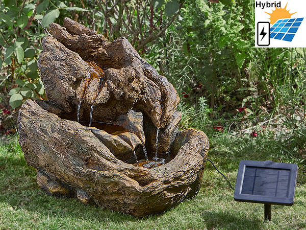The Wychwood Falls Hybrid Solar Water Feature is a highly detailed artificial log cascade water feature. Watch as the water cascades through different levels which creates a gentle trickling noise as it runs. Water is pumped from the base of the feature to the top pool and then it drops down through the feature. Made from highly detailed resin and powered by a separate solar panel which connects via a 3m cable and includes integrated hybrid battery technology. The On / Off switch on the back of the panel allows the panel to run the pump and charge the battery when the sun is shining and when it is overcast the battery can power the pump on its own. Prior to special occasions the switch can be set to the Off position, this allows the panel to fully charge the battery, storing 4-6 hours of power for when the feature is switched back on.