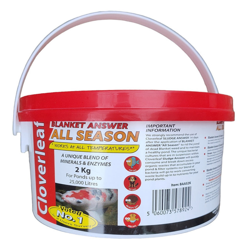 Cloverleaf Blanket Answer All Season - 2Kg - is a new addition to the UK's bestselling blanketweed treatment range. Blanketweed can grow at cooler temperatures than other pond plants and tries to establish itself as the dominant plant species in a pond early in the early Spring. Until now you just had to wait for the temperature to rise before you could treat the water, but this version of the Blanket Answer from Cloverleaf can be used from temperatures as low as 2°C, so you can tackle the problem almost before it gets started. Blanket Answer has long been a favourite option for UK pond keepers with its unique blend of minerals and enzymes, now has a new unique formula which is still perfectly safe with for use with all pond fish, plants, and biological filtration systems. A single dose is often enough but it can be used all year round should you need a follow up dose. When applied the water may go milky for 2-5 days but this will clear, and results can normally be seen within 14 days.Works at temperatures as low as 2°C